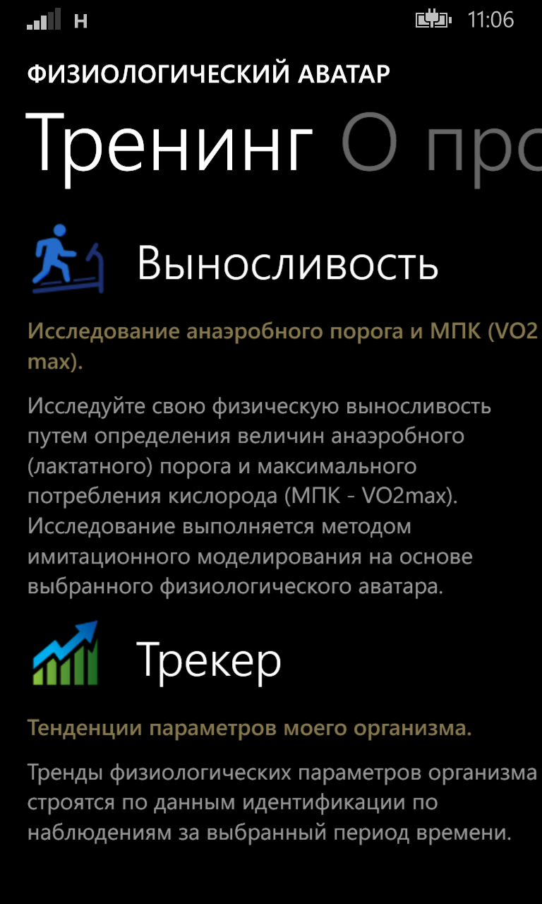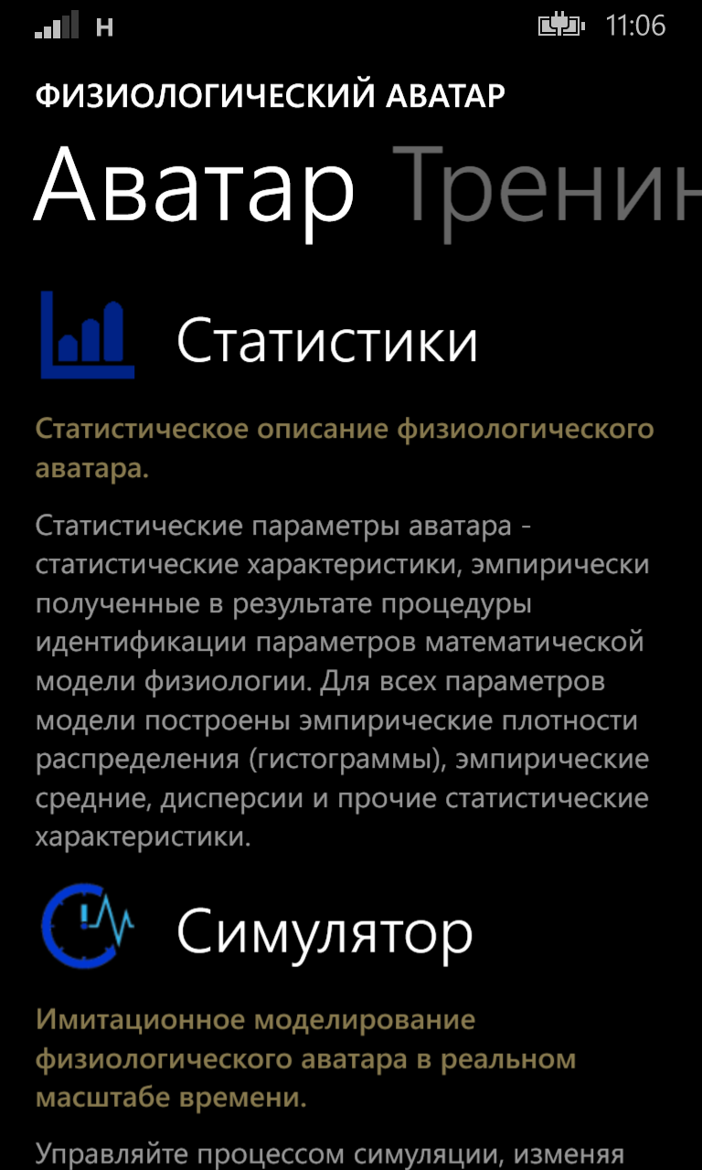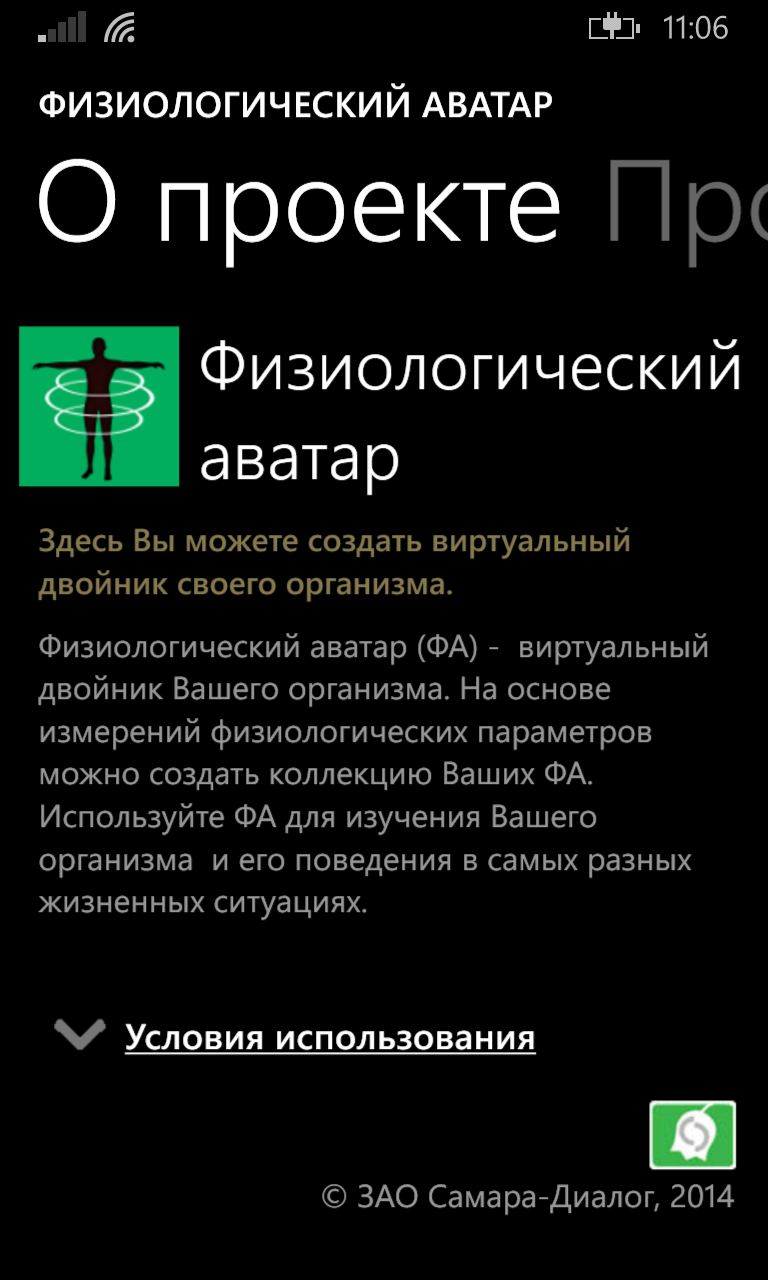 В связи с устареванием программной платформы Windows Phone это программное приложение в настоящее время не поддерживается. Все его функции реализованы и поддерживаются в других клиентских приложениях технологии Физиологический аватар на более современных программных платформах.