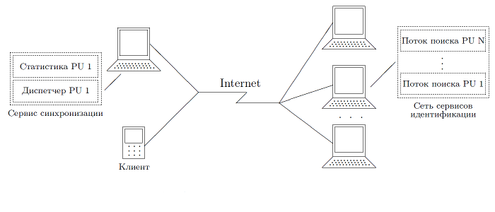 Фабрика идентификации представляет собой сеть вычислительных сервисов, которая состоит из многих виртуальных компьютеров, включенных в Internet. В этой сети каждый сервис идентификации выполняет глобальный случайный поиск минимума критерия идентификации для количества точек исходной выборки, равного числу процессоров сервера, и отправляет результаты поиска сервису синхронизации. Сервис синхронизации отправляет каждому сервису идентификации запросы на выполнение поиска по одной точке выборки на каждый свободный процессор, ожидает возврат результата и формирует статистику по всей выборке.